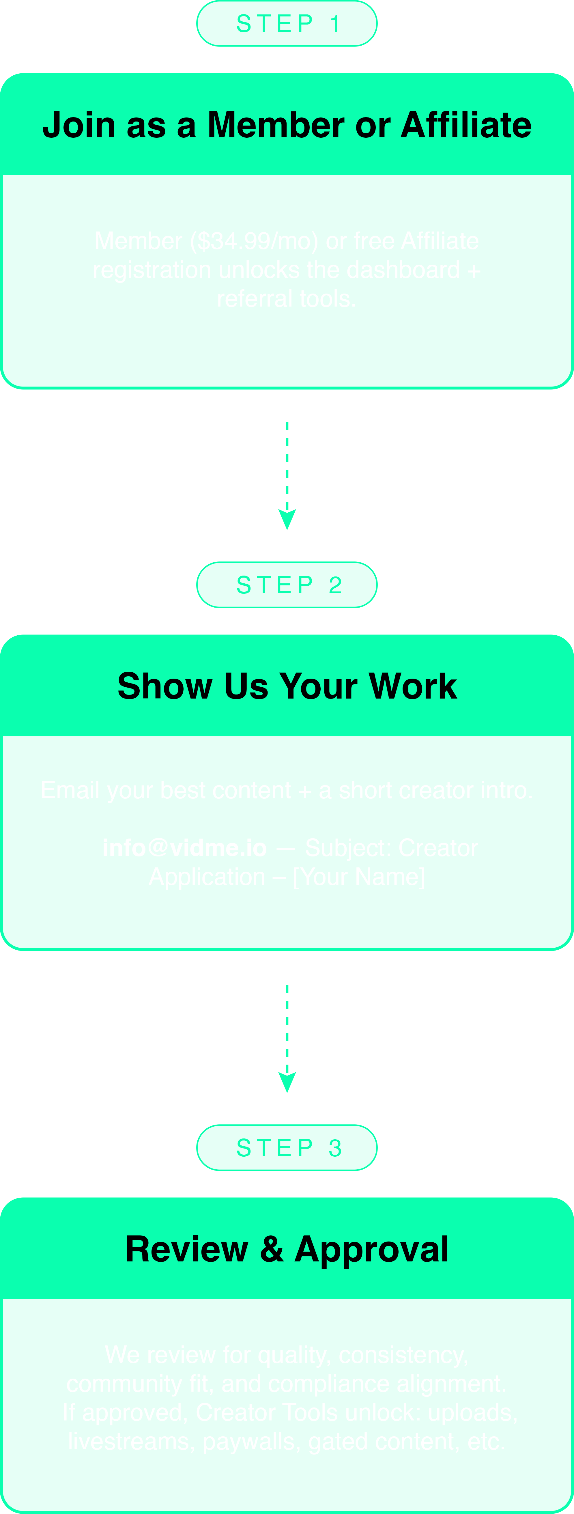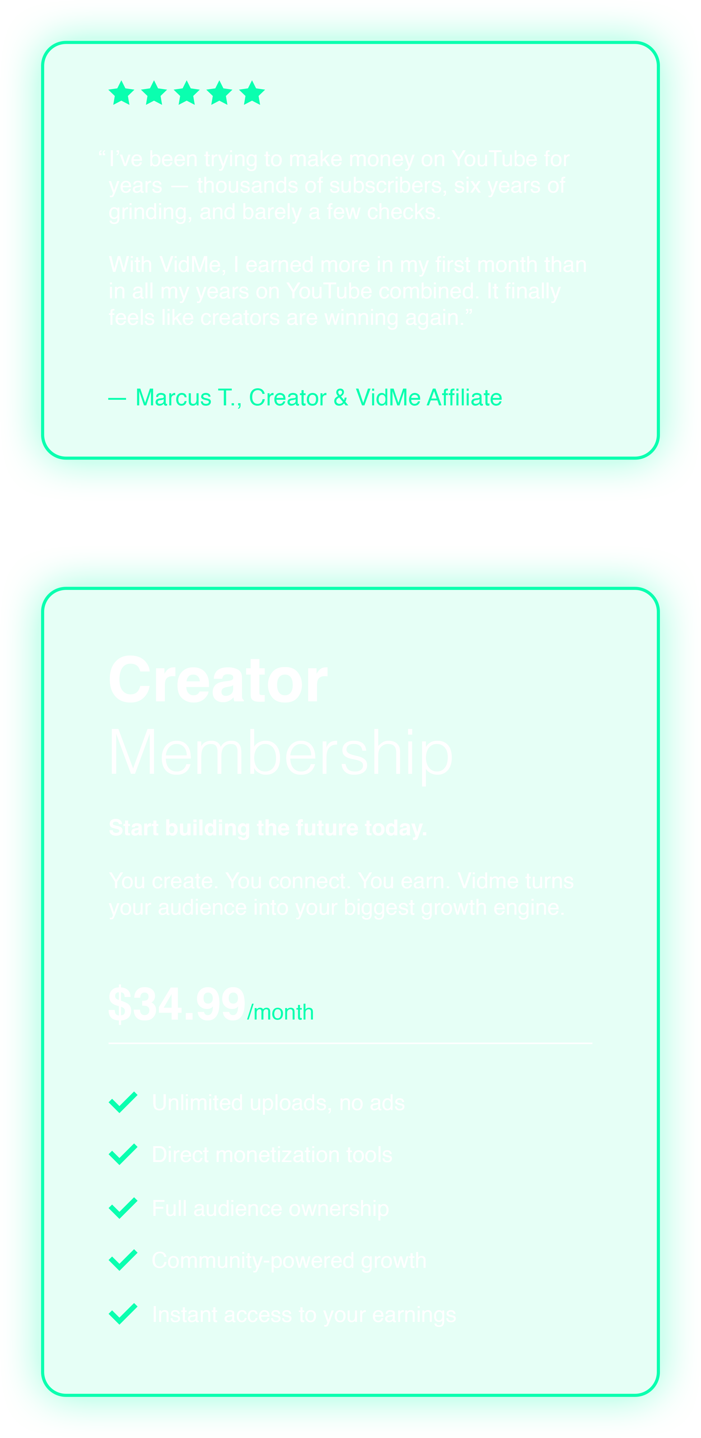VidMe flips that model by giving creators a way to earn lifetime recurring revenue through community ownership and affiliate sharing — meaning they can finally step off the hamster wheel and still get paid.